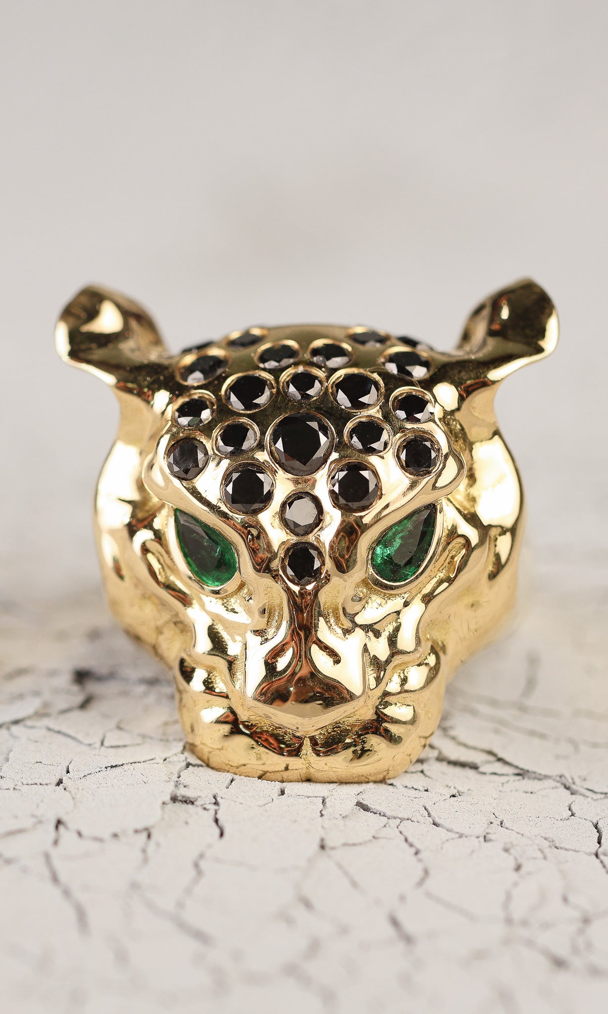 Forjado em ouro 18K, o Anel Îagûar-eté traz a intensidade dos diamantes negros como as manchas da nossa onça-pintada, reflexo da força indomável que habita as profundezas da floresta amazônica. O olhar de esmeraldas realça a cor do ouro amarelo, dominando o ambiente.